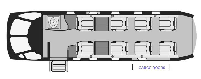 The cabin has room for 8 passengers with really generous legroom and adjustable seats. For longer flights, you'll appreciate not only the airy space and great seats, but also the on-board lavatory.